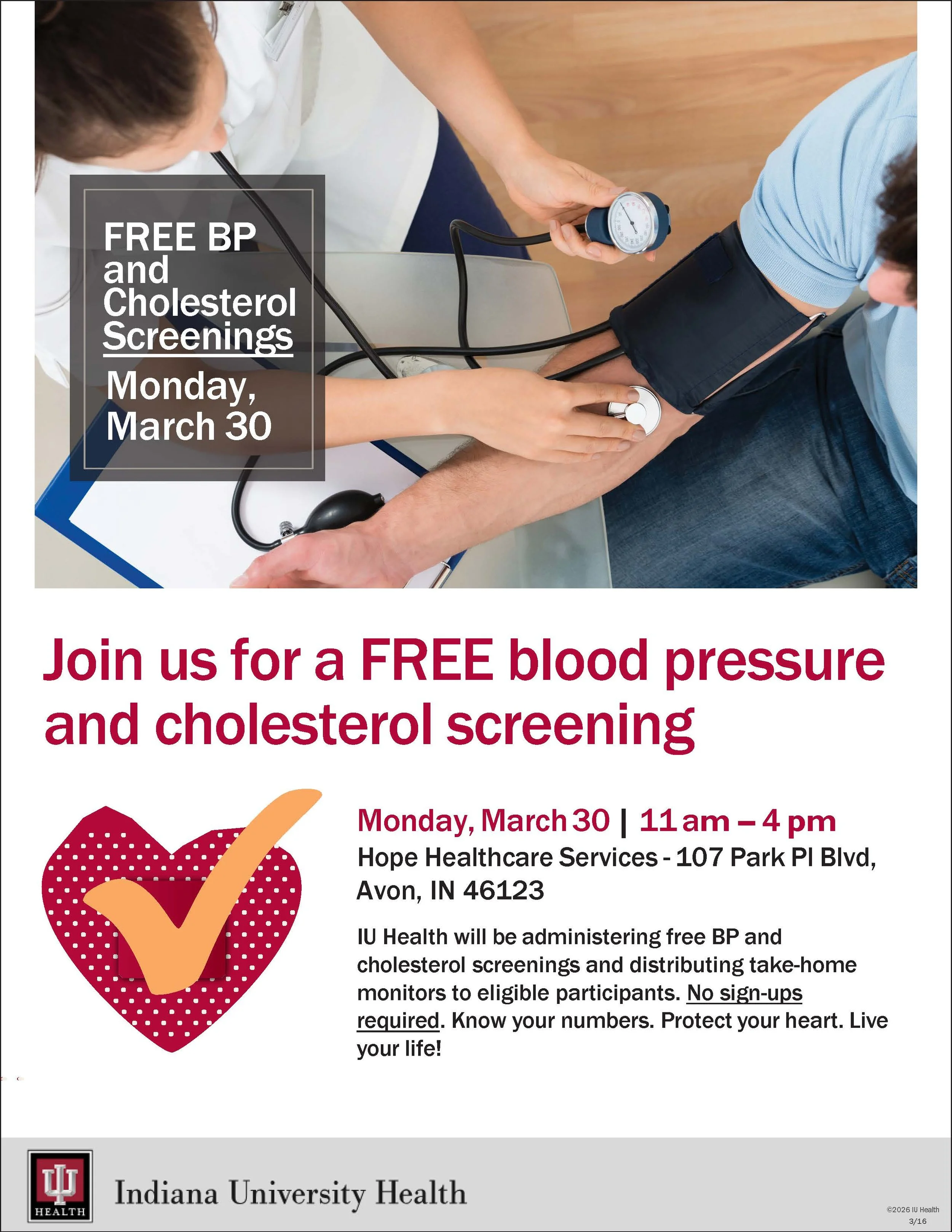 IU Health will be administering free BP and cholesterol screenings and distributing take-home monitors to eligible participants. No sign-ups required. Know your numbers. Protect your heart. Live your life!