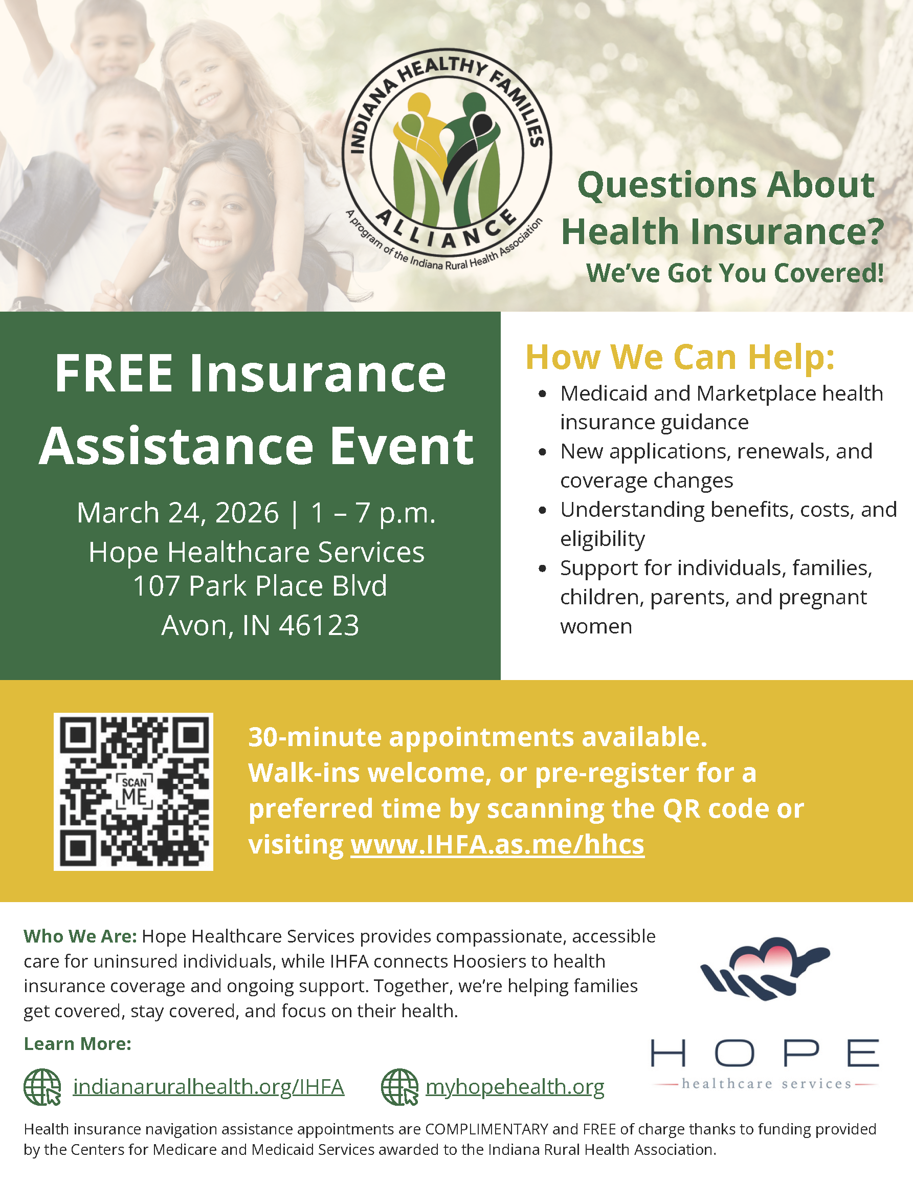 30-minute appointments available. Walk-ins welcome, or pre-register for a preferred time by scanning the QR code or visiting www.IHFA.as.me/hhcs